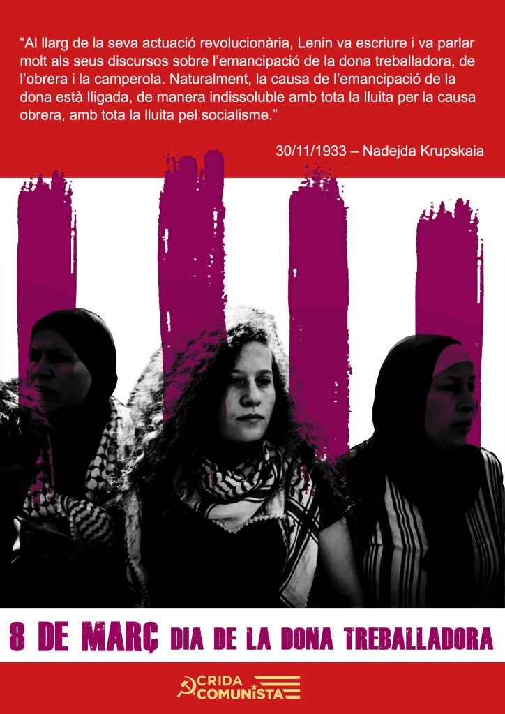 El 8 de MARÇ és una jornada de caràcter internacional per a les treballadores. En l’actualitat ens trobem sota el foc de la guerra i la barbàrie capitalista. A Palestina i a l’anomenat Orient Mitjà s’està massacrant en nom de la llibertat i la democràcia d’Occident. Milers de dones i nens són assassinats diàriament, i milers més han estat ferits de gravetat. A Gaza, el genocidi no sols és contra els vius, sinó que es perpetua contra les futures generacions.